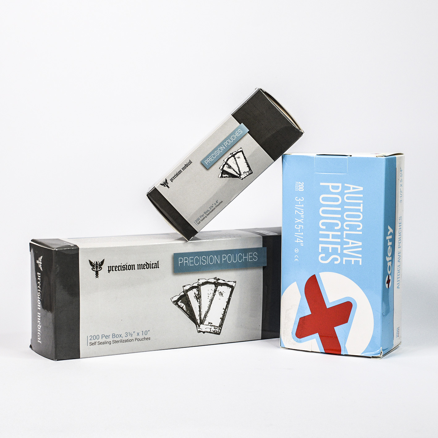 Caja con 200 bolsas, útiles para esterilizar material en autoclave con cinta autosellable, e indicadores de esterilización.