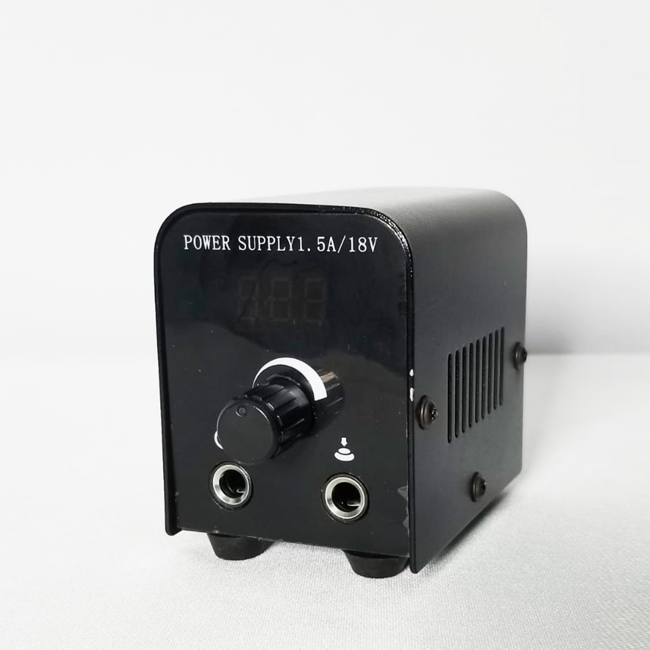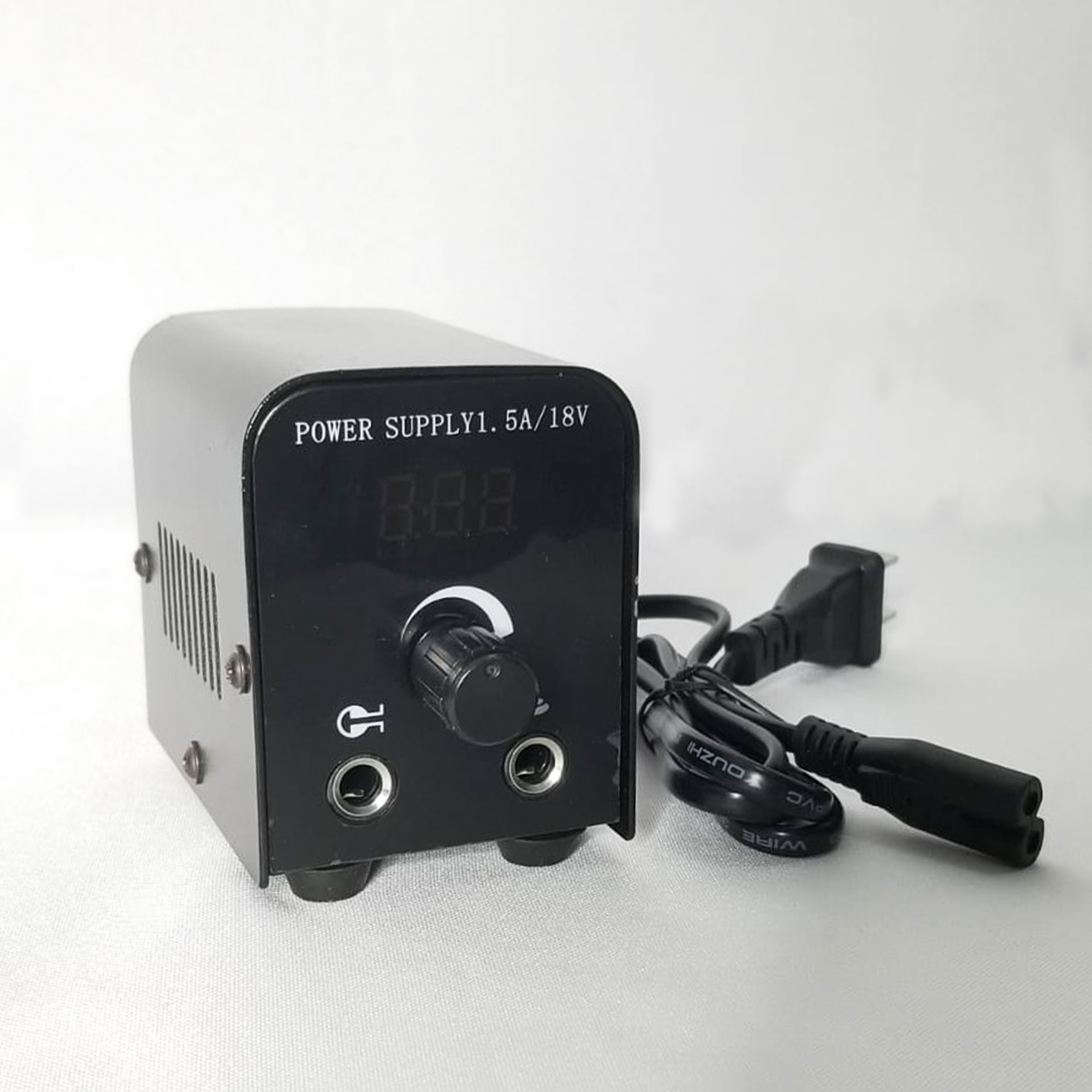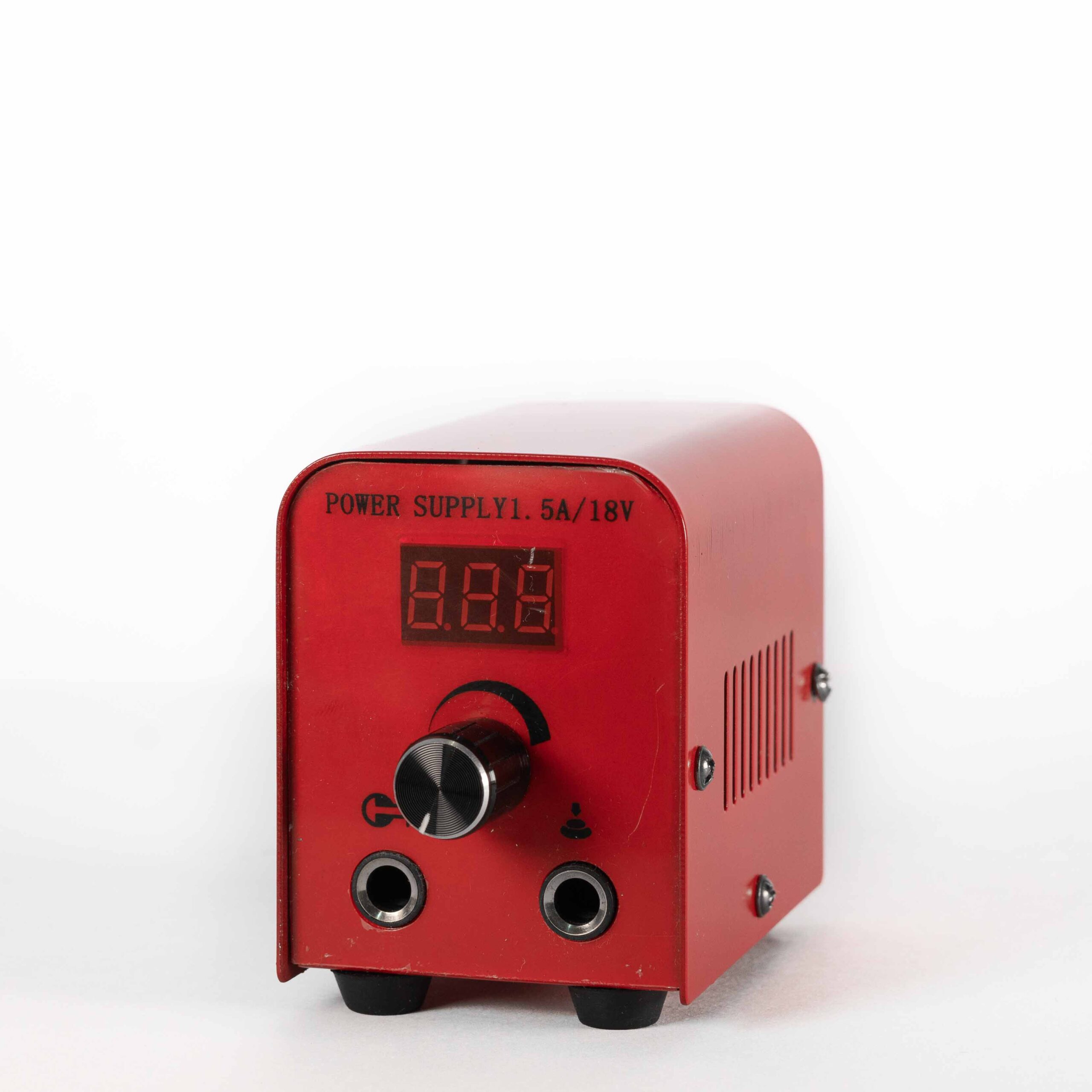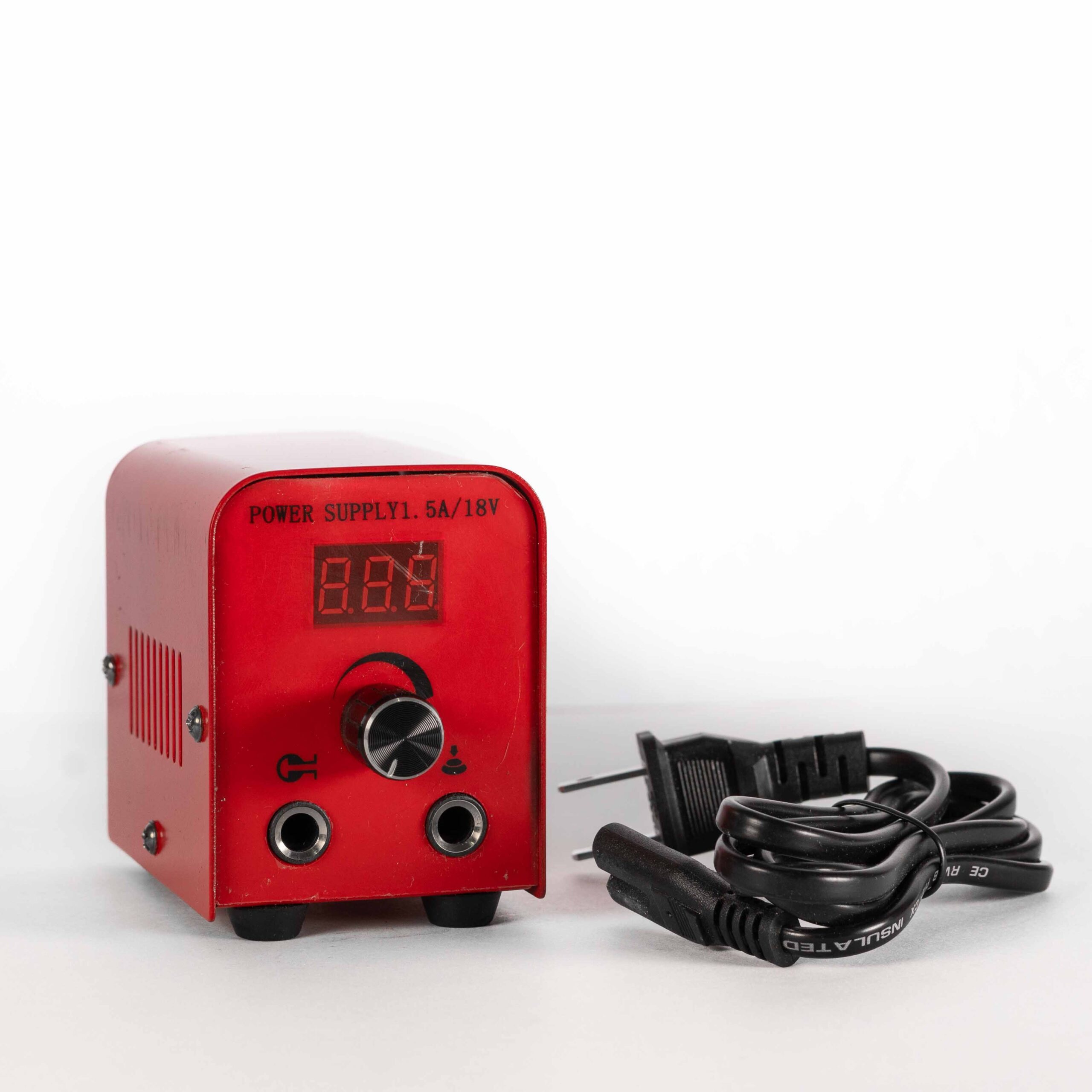 Esta fuente para tatuar cuenta con una perilla de ajuste de voltaje de salida y pantalla digital que indica el voltaje.