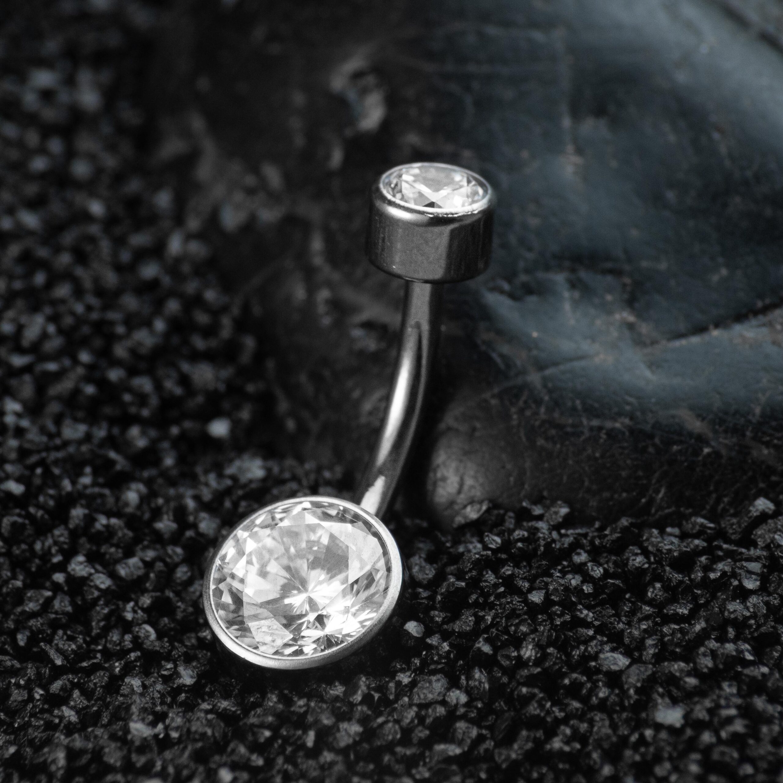 Pieza para perforacion de ombligo fabricada con titanio grado implante, calibre 14, con gemas incrustadas.