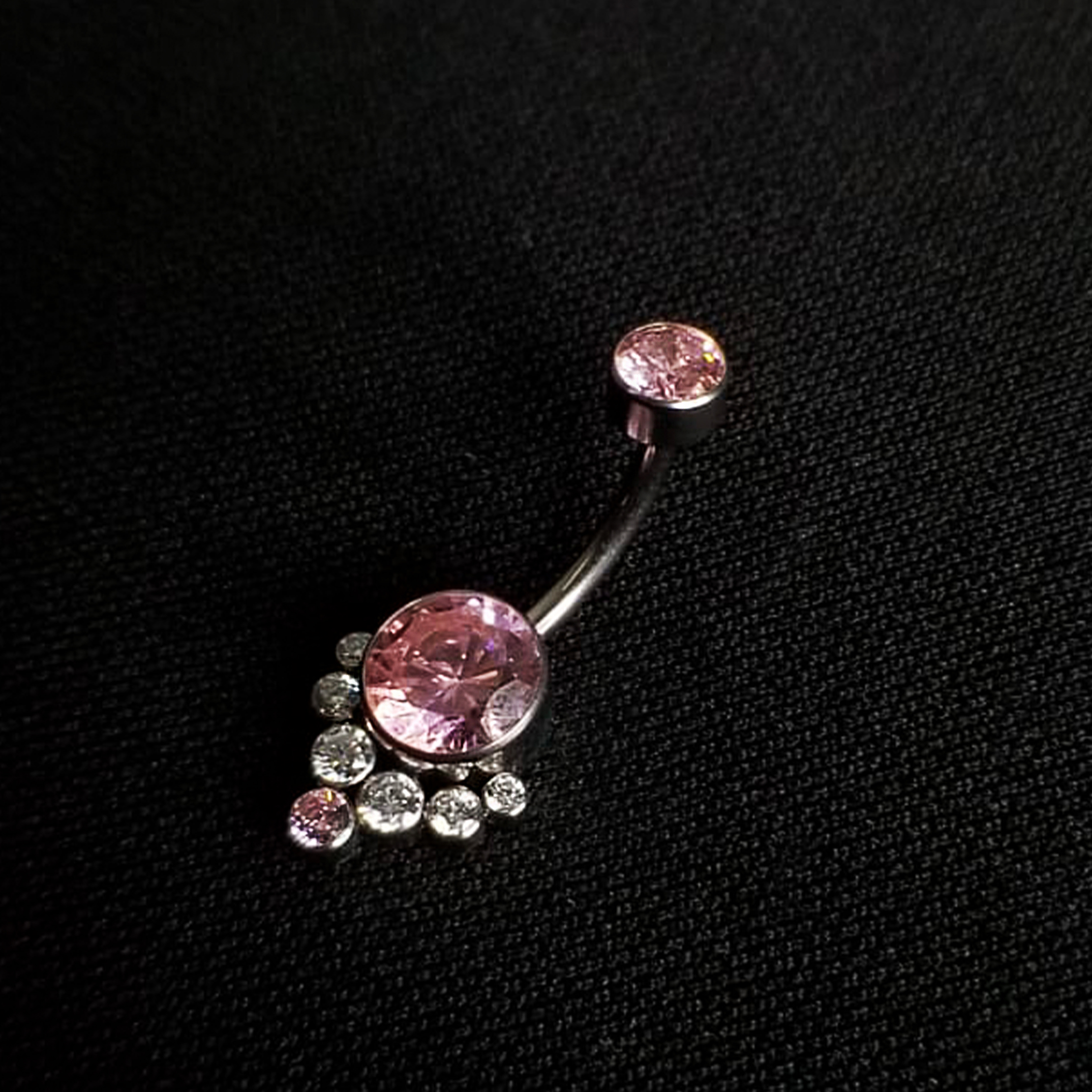 Pieza para perforacion de ombligo fabricada con titanio grado implante, calibre 14, con gemas incrustadas en color Rosa y Claras