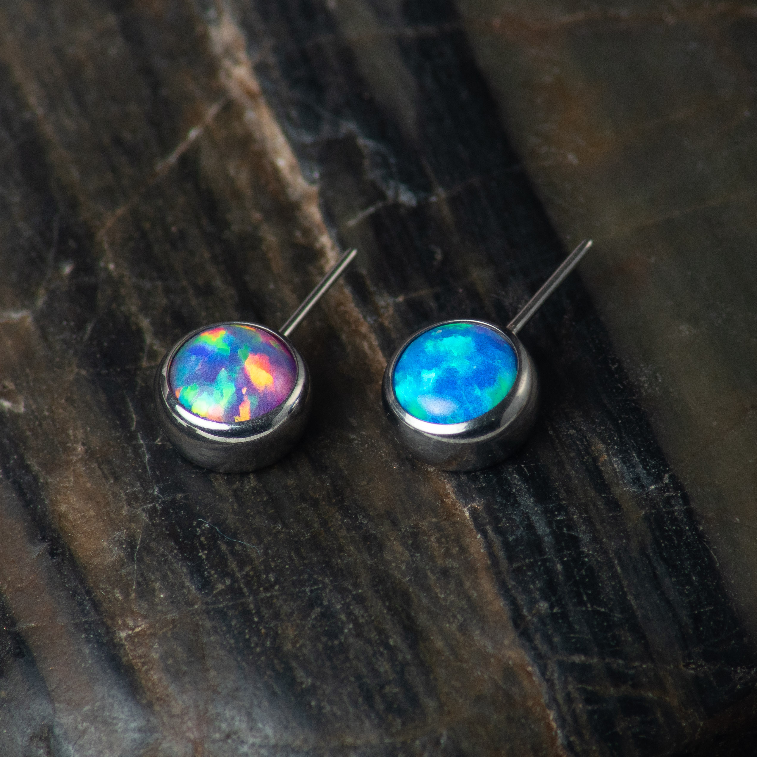 Threadless Top fabricado con titanio con incrustación de ópalo en dos colores.